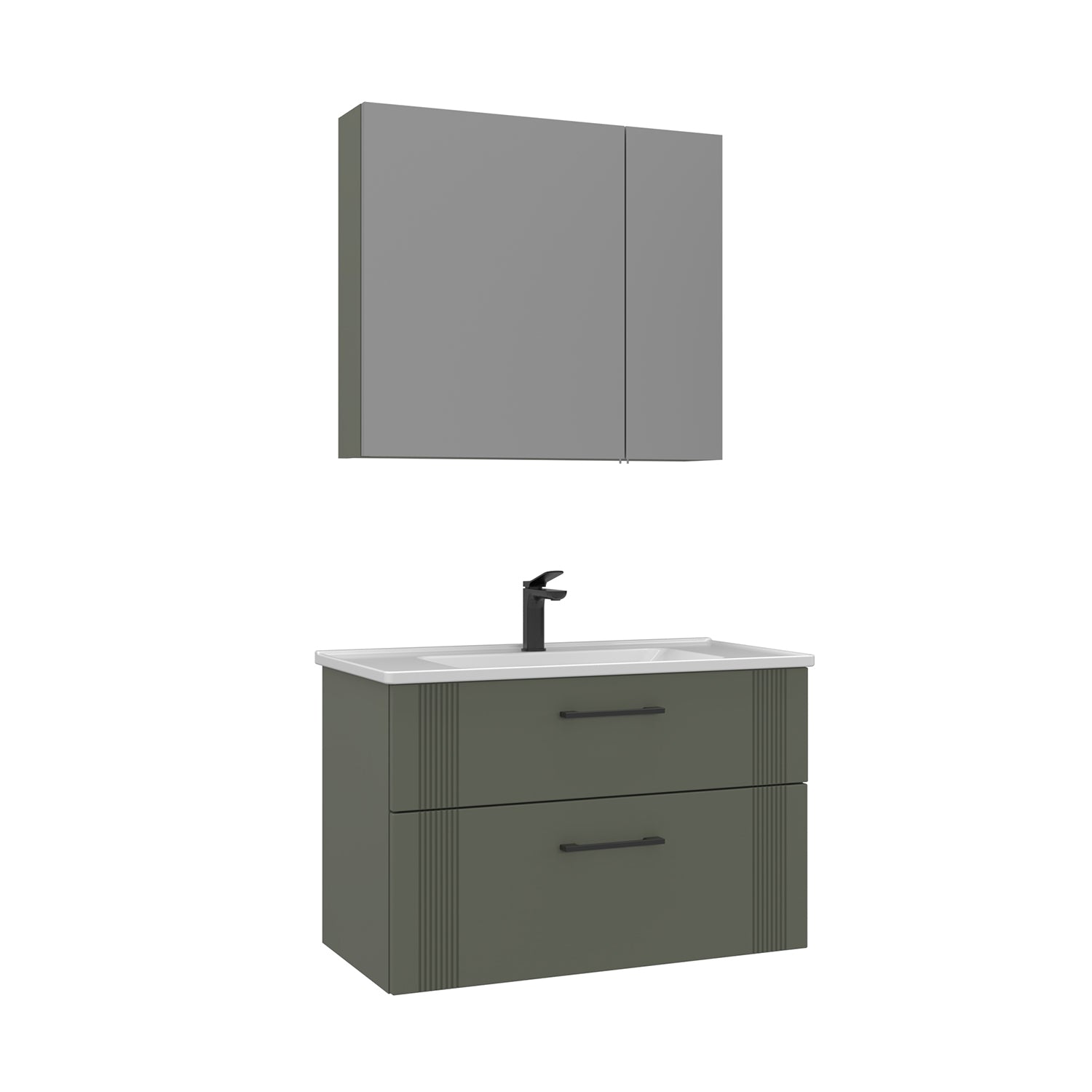 Orka Bari V2 85 cm Çekmeceli Aynalı Dolaplı Banyo Dolabı Takımı | Dolaplı | Mat Yeşil